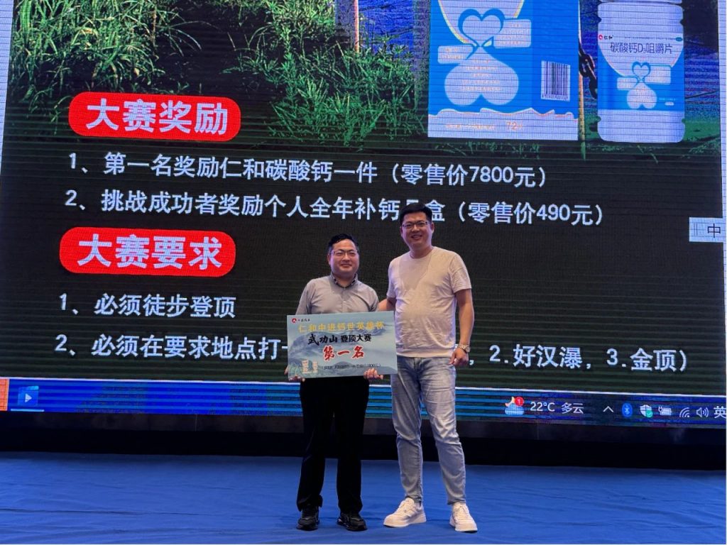在登頂武功山環(huán)節(jié)中,增添了《鈣世英雄》登山比賽,為客戶朋友們添上了登山彩頭。參與者們需徒步上山,而每一位完成比賽的人都將獲得本人全年所需的補鈣鈣片作為獎勵。其中,表現(xiàn)最為卓越、奪得第一名的選手,更是能夠榮獲一整箱碳酸鈣D3咀嚼片的殊榮。經過精彩激烈的角逐,來自河南省鄭州市地區(qū)的范鐵軍先生斬獲頭籌!
