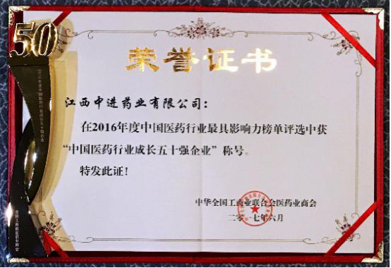 6月,中進藥業榮獲“中國醫藥行業醫藥商業50強企業”、“中國醫藥行業成長50強企業”、“中國醫藥行業守法誠信企業”三項全國工商聯醫藥商會2016年度中國醫藥行業最具影響力榜單。